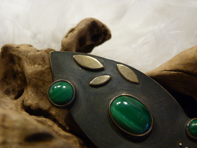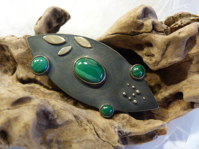 Zilveren broche/hanger in de vorm van een elips met malachiet en gouden elipsen en bolletjes.