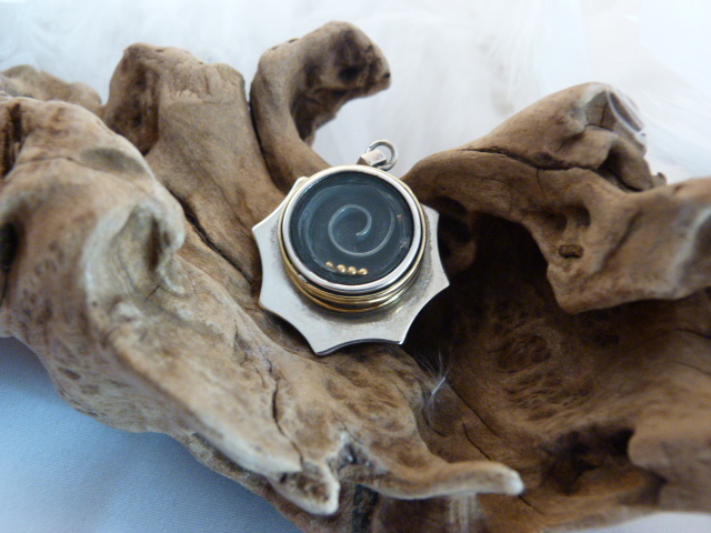 Hanger cirkel op een plaat met een kartelrand. Binnenin de cirkel zit een spiraal met gouden bolletjes erin. Om de cirkel zit goud draad en bovenop een glazen plaat.