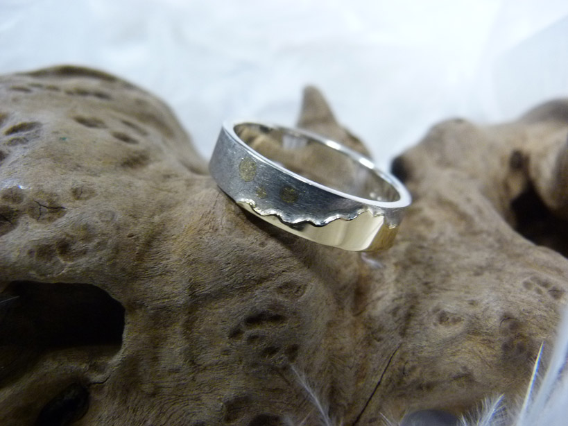 Ring zilver mat met een gouden gegolfd plaatje er boven op. In de ring zitten drie gouden puntjes.