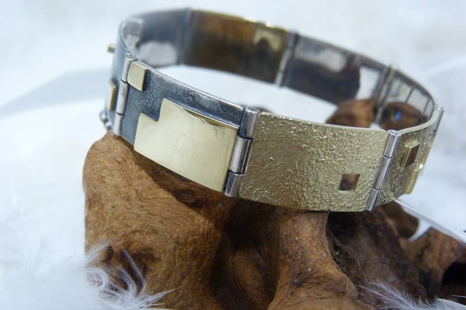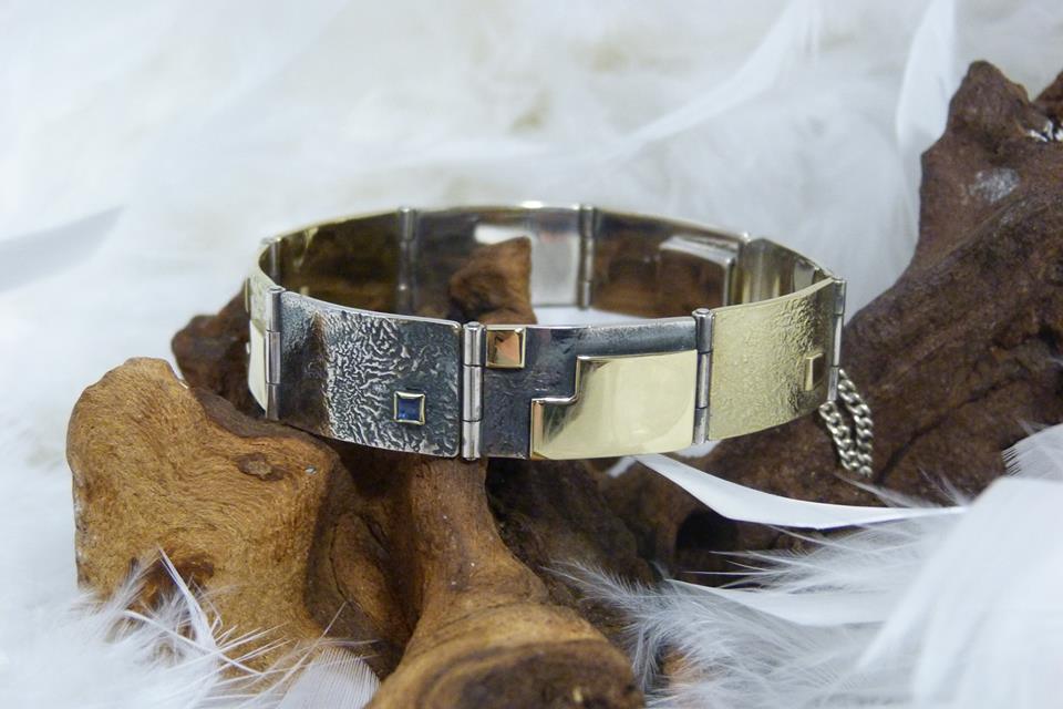 Een armband gemaakt van oude bestaande sieraden, combinatie van zilver goud en een saffier.