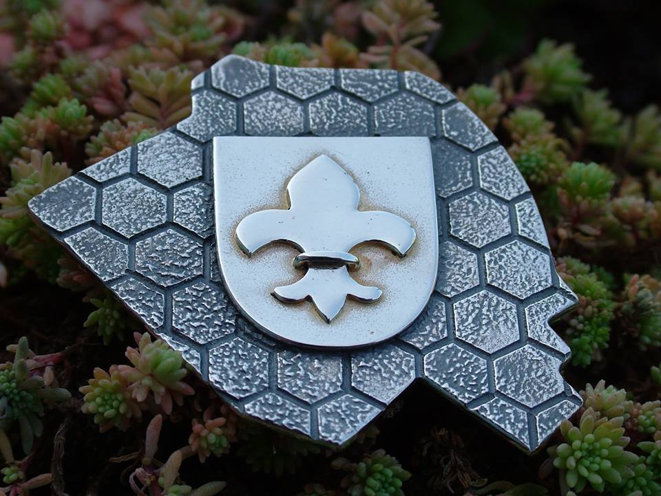 Zilveren speld voor de bodes van de gemeente Lelystad. De vorm van de speld geeft de gemeente grens aan en erop zit een schild met een lely.