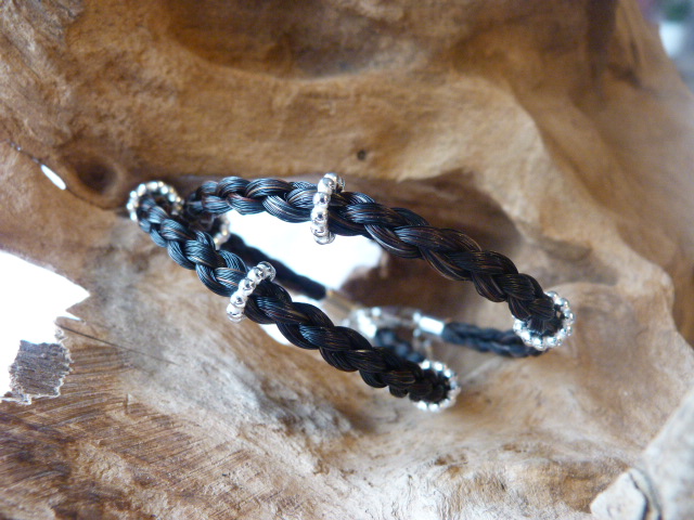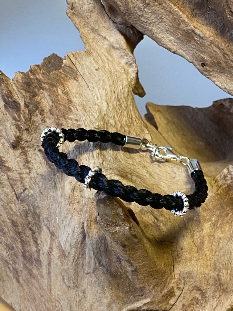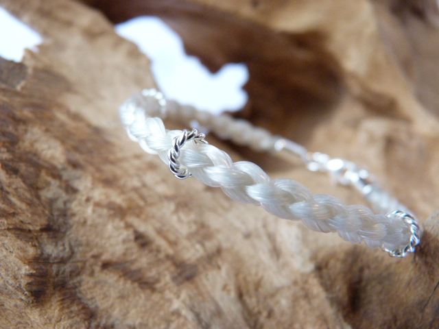 Armbandje van paardenhaar. Om de bandjes zitten drie elementjes van pareldraad. Hier kan je mee variëren.