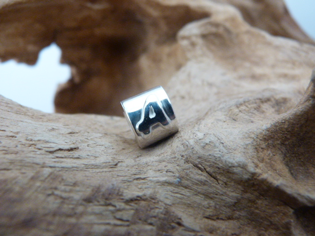 Zilveren bedel met op het plaatje een letter A gesoldeerd. In de bedel zit een vlecht paardenhaar.