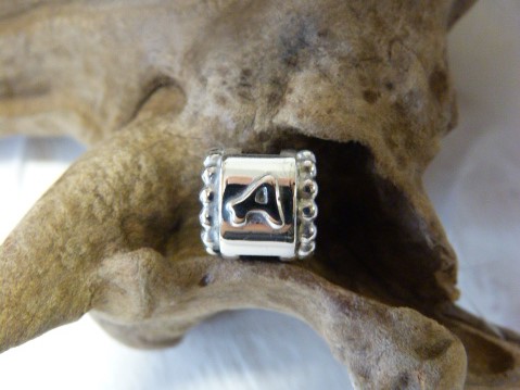 Zilveren bedel met boven op het plaatje een letter. In de bedel zit een vlechtje met paardenhaar. De bedel past om een Pandora armband.