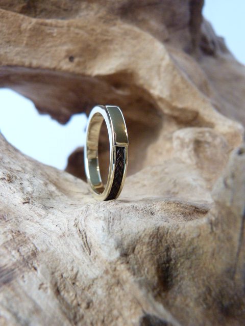 Gouden smalle ring met een fijn vlechtje paardenhaar. De ring is ongeveer 4 mm breed. De prijs is een indicatie. E.a. is afhankelijk van de maat en goudprijs.