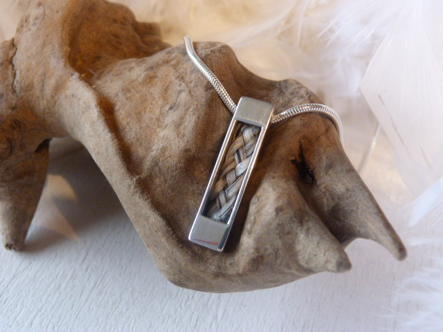 Zilveren strakke hanger met erin een 4 strengen vlecht van paardenhaar. De hanger is exclusief het slangencollier. Deze is los te bestellen.