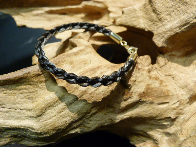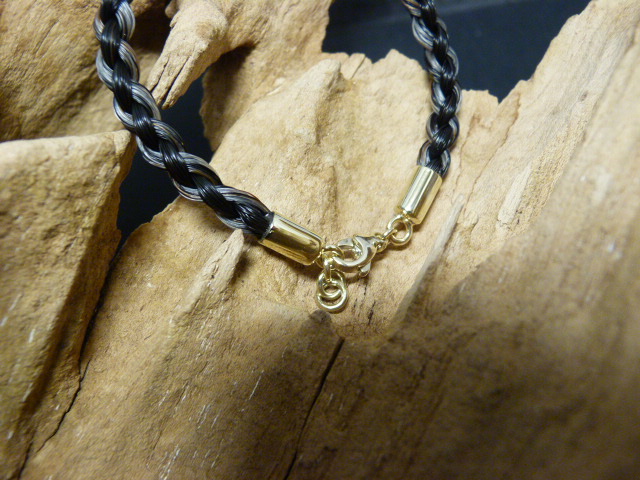Een koord armband van paardenhaar. De armband heeft gouden uiteindes en sluiting. De prijs is een ongeveer prijs. E.a. is afhankelijk van de maat en goudprijs.