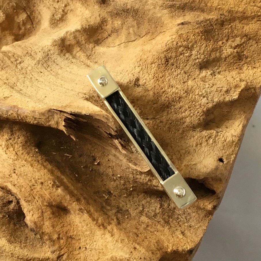 Plastronspeld met erin een vierstrengen vlecht van paardenhaar. Aan beide zijde zit een zirkonia.