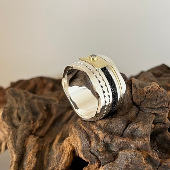 Ring zilver met een gouden draadje en plaatje. Er tussen zit een wat platter bandje van pareldraad en de weerszijden zijn gegolfd. Erin zit een vlechtje paardenhaar. De prijs is voor de ring exclusief steentje, de meerprijs hiervoor is afhankelijk van het soort steentje.