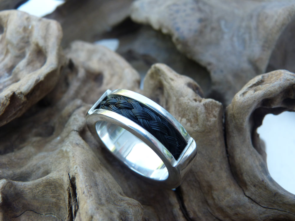 Zilveren wat dikkere ring met alleen aan de bovenzijde een stukje open. Er in zit een vierstrengenvlecht van paardenhaar.