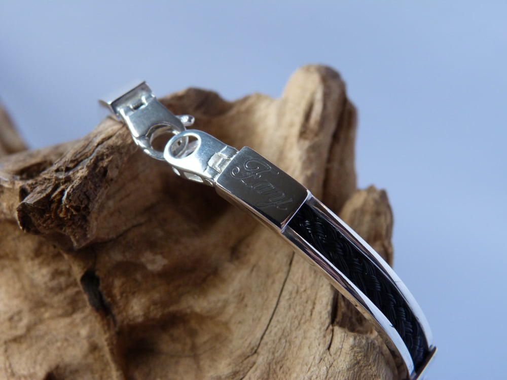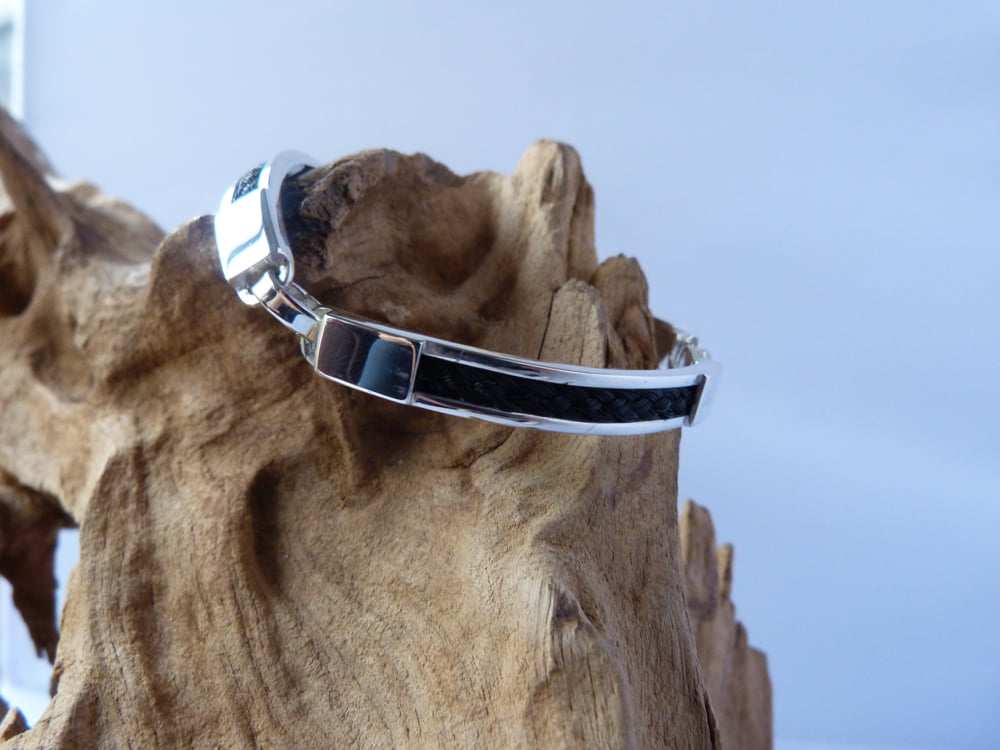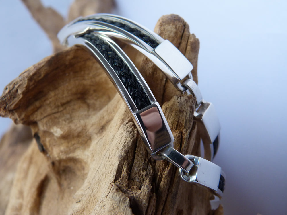 Zilveren flexibele slavenarmband bestaande uit drie schakels. De sluiting is een twee delige karabijnhaak. In de schakel zit een 4 strengen vlecht.