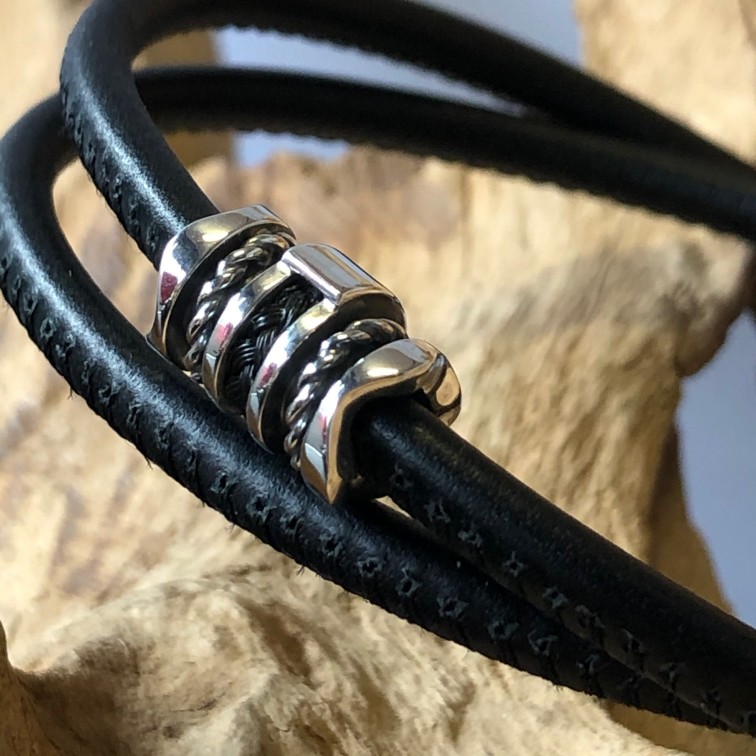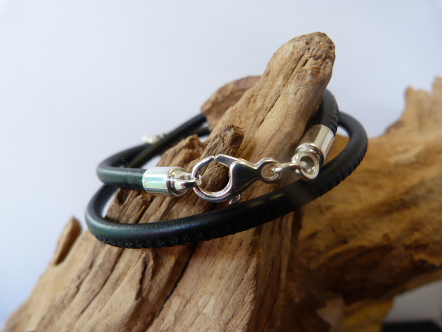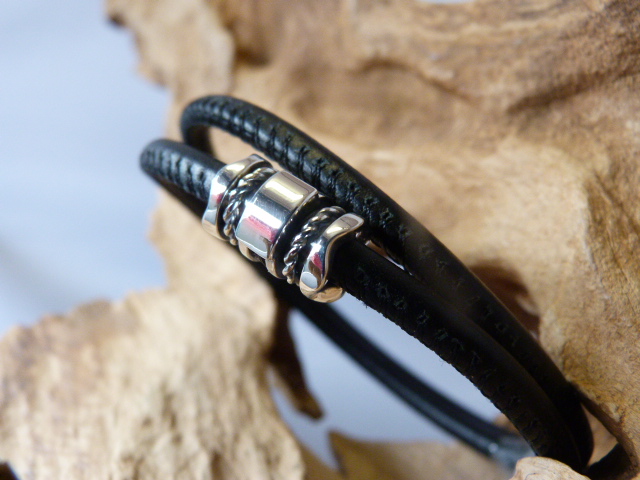 Hier zit hij om een leren armband, deze kan enkel of dubbel. Deze prijs is inclusief armband. Deze armband heeft een karabijn sluiting. Het is ook mogelijk met een magneetsluiting.