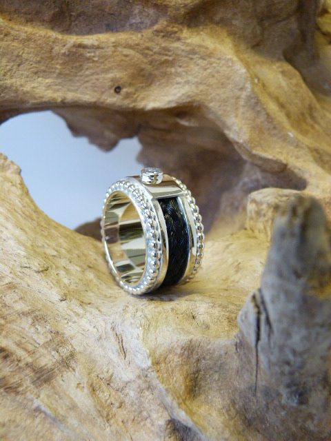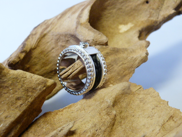 Zilveren bredere ring met aan de buiten zijdes een rand pareldraad. In het afdekplaatje zit een zirkonia. Er in zit een wat bredere vierstrengen vlecht paardenhaar.