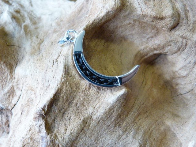 Zilveren hanger in de vorm van een maan. In de maan zit een vlechtje paardenhaar.