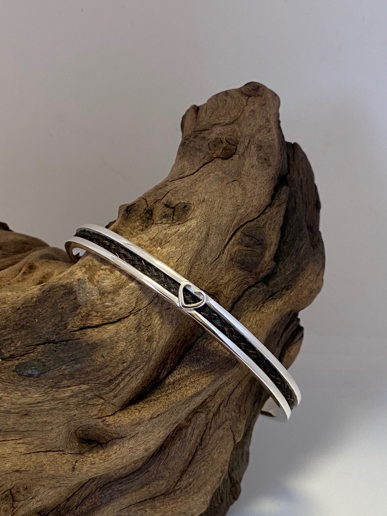 Zilveren klemarmband met een open hartje en een vier strengen vlecht van paardenhaar. Dit is een vanaf prijs e.a. is afhankelijk van de breedte van de armband.