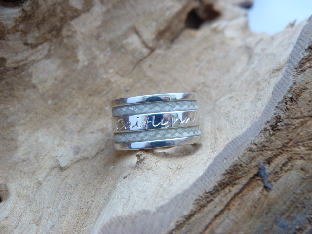 Zilveren wat bredere ring met twee vlechtjes paardenhaar. Op de middelste band staat een naam gegraveerd. De prijs is exclusief de gravure. Deze prijs e.a. is afhankelijk van het aantal letters en wordt met de hand gegraveerd.