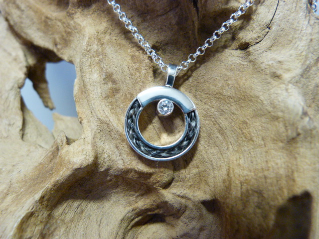 Zilveren ronde hanger met paardenhaar en een zirkonia