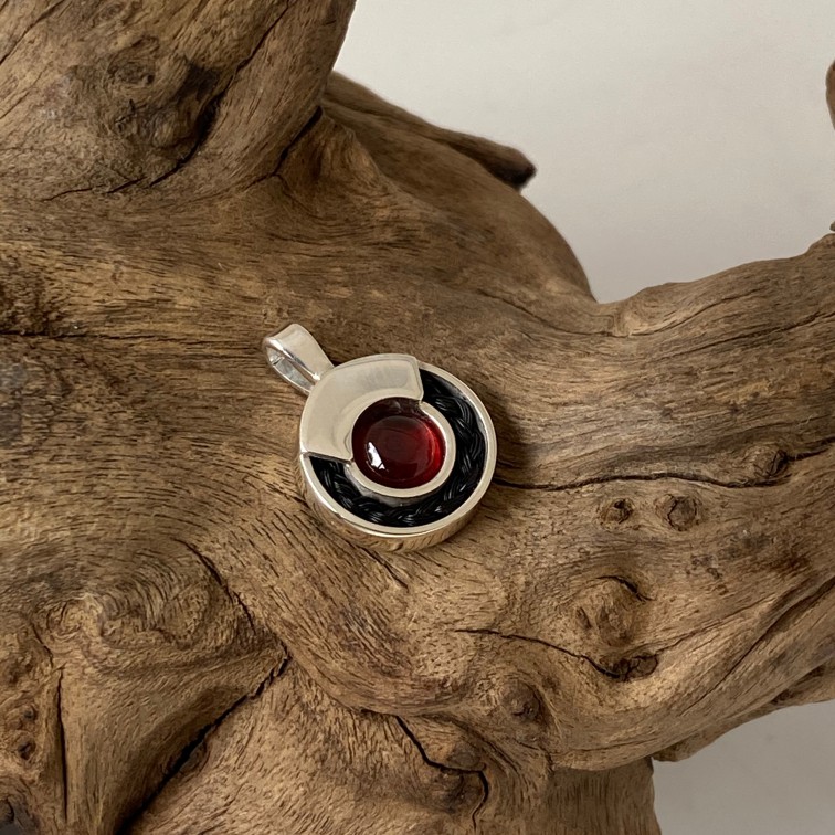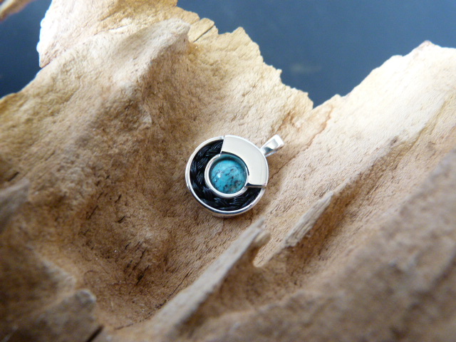 Zilveren ronde hanger met in het midden een turqoise. In de rand zit een vlecht paardenhaar. De prijs is afhankelijk van het soort steen wat erin zit.